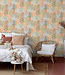 Botanisch met een warm okeraccent: blauwgroene bladeren en zachte perziktonen zorgen voor een zonnig statement. In bladeren oker/blauw komt het dessin extra mooi tot zijn recht en krijgt je ruimte direct meer karakter. Heel gaaf in de eetkamer of hal; staat prachtig bij messing, donker hout en warm beige.